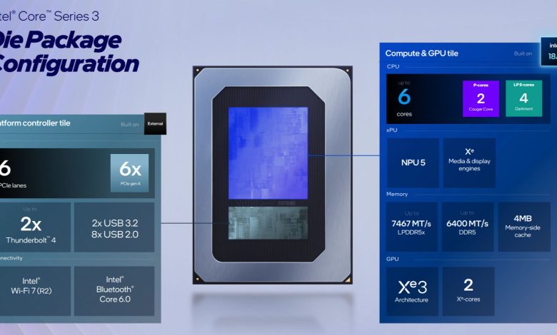 در کنار این موارد، اینتل از یک طراحی بستهبندی کوچکتر مرتبط با Wildcat Lake استفاده میکند. در این سیلیکون، کاشی پردازشی گرافیک را بهصورت یکپارچه در خود جای داده و کاشی کنترلر پلتفرم به 6 مسیر PCIe 4.0 کاهش پیدا کرده است. اینتل برای این پلتفرم، چیدمان پردازنده 6 هستهای شامل 2 هسته P و 4 هسته LPE، واحد NPU 5 و گرافیک مجتمع Xe3 با 2 هسته Xe3 را فهرست میکند. همچنین پشتیبانی از 2 پورت Thunderbolt 4، Wi-Fi 7 و بلوتوث نیز در نظر گرفته شده است.