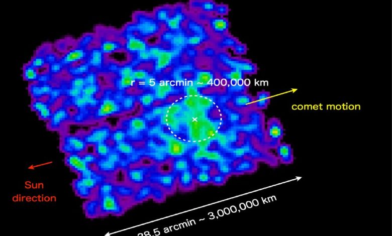 میدان دید عکس ثبتشده در پرتو ایکس از دنبالهدار، منطقهای را به مساحت حدود سه میلیون کیلومتر مربع پوشش میدهد و پرتوهای ایکس را از منطقهای به مساحت حدود ۴۰۰ هزار کیلومتر در اطراف هسته دنبالهدار آشکار میکند. این میتواند ناشی از ابر گازی پراکندهای باشد که دنبالهدار را احاطه کرده است؛ اگرچه نیاز به تجزیه و تحلیل بیشتر دارد.